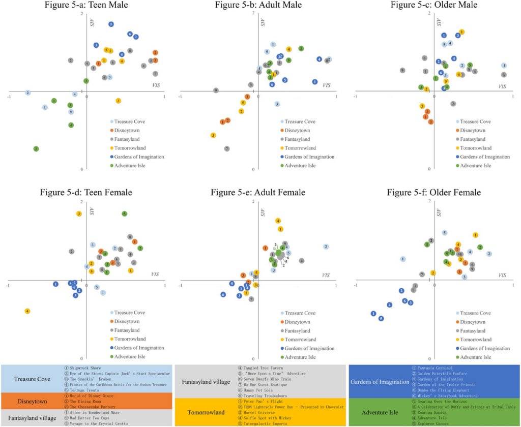 总体而言,不同性别和年龄群体在主题公园内的情绪状态及其差异可能由多种因素共同作用所致。其生活阶段、社会角色、消费观念和文化记忆,深刻影响着情绪反应。一方面,不同群体对旅游体验的期望和偏好存在差异,导致其在特定景点上的情绪反应不同。另一方面,景点设计和活动安排也可能对特定群体产生不同的情绪激发作用。例如,冒险类活动可能更受青少年女性欢迎,而休闲类活动则可能更受成年女性和老年群体青睐。