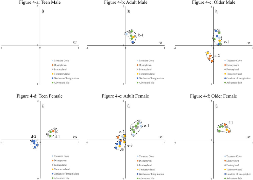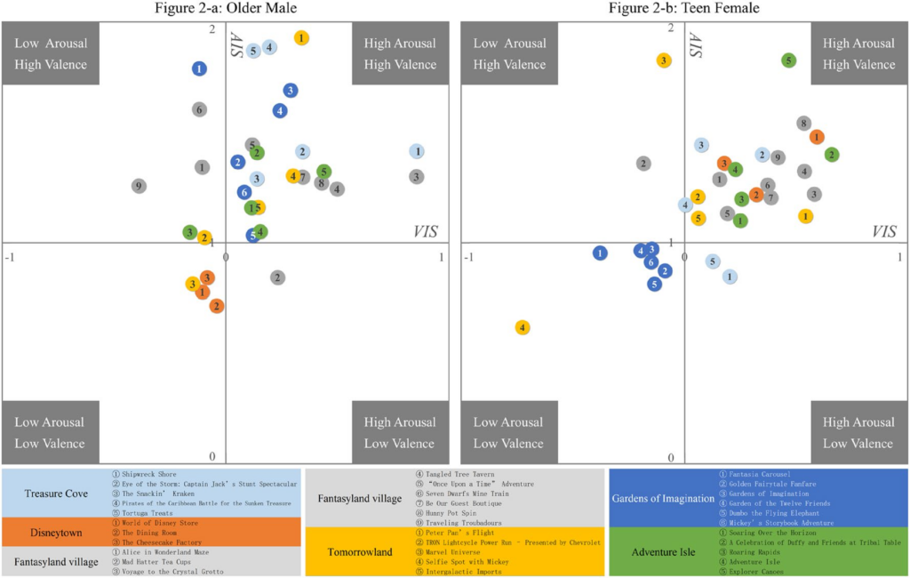 成年男性和女性在“迪士尼小镇"主题区的情绪状态存在显著差异(图5)。成年男性表现出较低的效价和唤醒度值,社交媒体文本分析发现,他们常抱怨商品价格过高。相比之下,成年女性表现出较高的效价和唤醒度值。此外,成年男性在“明日世界"主题区表现出更高的兴趣。社交媒体文本分析发现,这可能是因为与他们的童年记忆有关,对早期迪士尼电影形象(如米老鼠、小飞侠)表现出更积极的情绪。