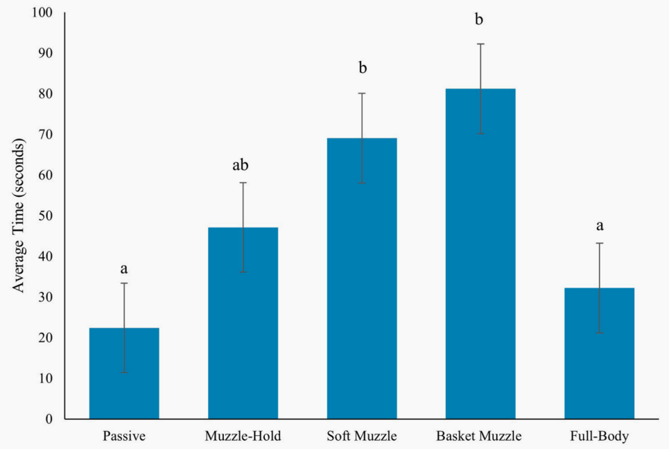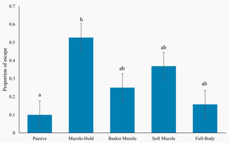 篮式口套:使用篮式口套配合被动约束。这种口套允许狗狗在口套内有部分口腔活动(如张嘴喘气和舔嘴唇),因为口套本身不接触狗狗的口鼻部,但限制了狗狗张口的程度。