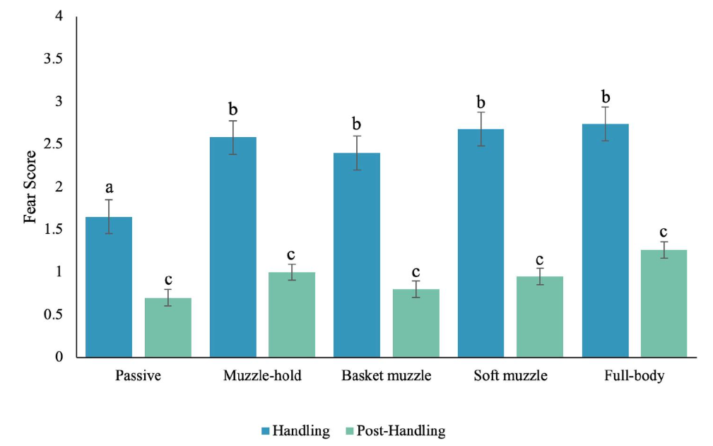 研究使用四个摄像机连续记录整个过程,并使用诺达思的行为观察记录分析系统(The Observer XT)评估行为。利用先前研究开发的动物行为谱对2分钟检查和30秒的处理后观察期间使用连续采样进行评分(表1)。用先前开发的量表为每只狗分配了恐惧评分。恐惧评分采用5分制(0=无恐惧,4=极度恐惧),基于身体姿势、回避/逃跑行为以及细微行为的表现进行评估。
