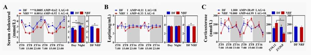 除了行为学监测,研究人员使用兽医直肠电子体温计测量直肠温度。除此之外,在兔子14周龄时,每组各取72只兔子,在24小时内每隔4小时,采集血清、肝脏、肌肉和脂肪组织样本。测定包括三碘甲状腺原氨酸和甲状腺素的血清浓度。测量血清中糖皮质激素和瘦素水平,以及总胆固醇。对肝脏组织横向冷冻切片进行中性脂质含量进行检测。测量肝脏甘油三酯、总胆固醇和β-羟基丁酸水平。检测脂肪组织中PPARγ蛋白的表达水平。测量分析肌肉内脂肪比例。另外,检测肝脏、肌肉和脂肪组织中生物钟基因和脂质代谢相关基因的表达水平等。