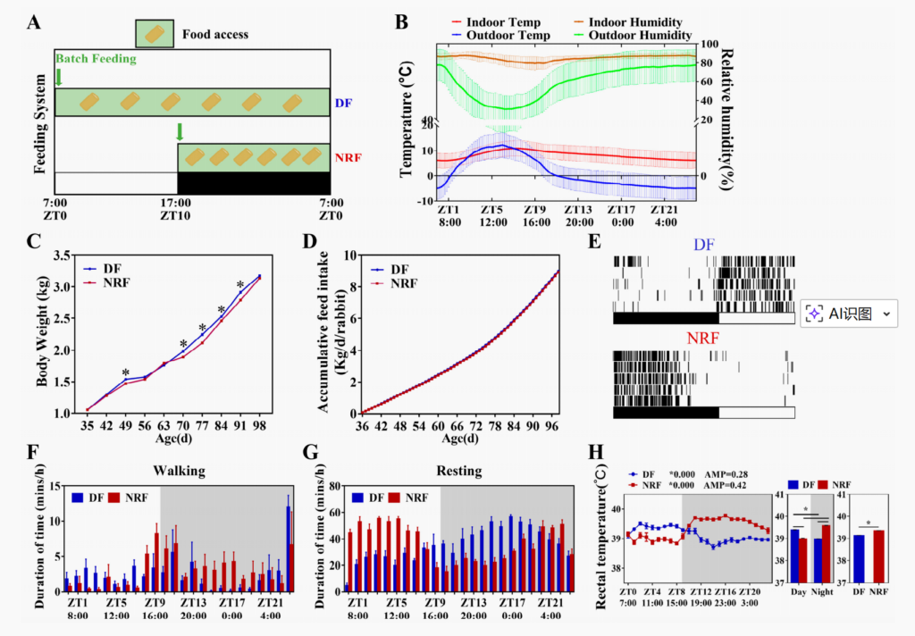 夜间限制性喂养组(NRF):下午5:00(日落时间)喂食,仅在此时间至次日早上7:00期间可采食。