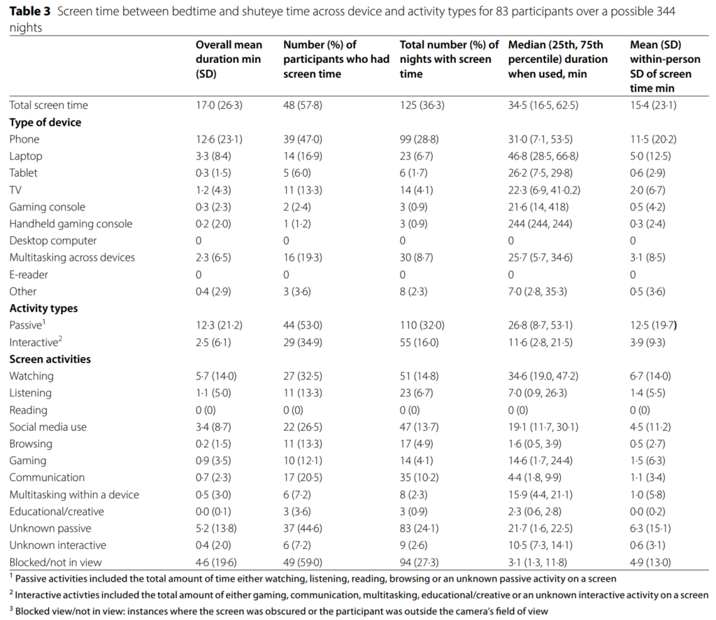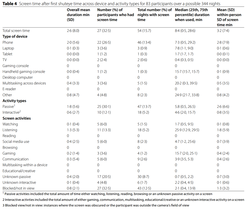 研究采用重复测量观察设计,在2021年3月-12月期间,对来自新西兰达尼丁的85名健康青少年被试(年龄:11-14岁)进行了为期一周的睡前屏幕使用行为观察。最终获得83人的有效数据。